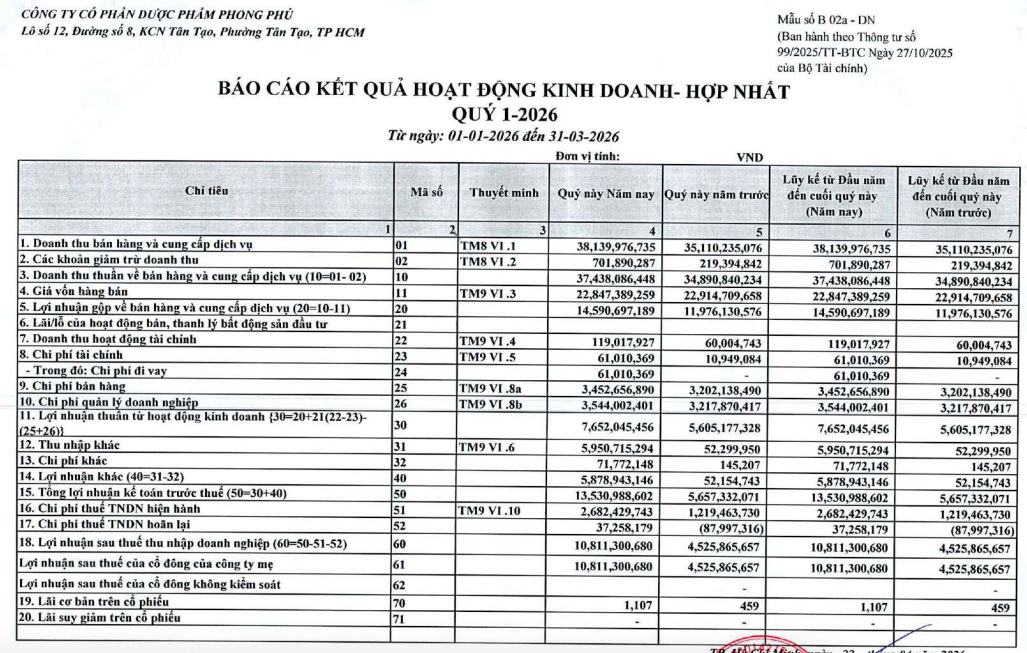 CTCP Dược phẩm Phong Phú (mã ck: PPP) vừa công bố báo cáo tài chính quý I/2026 với những con số ấn tượng.