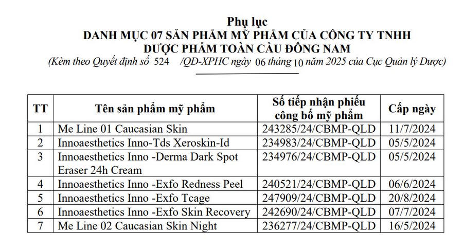 Theo đó, Dược phẩm Toàn cầu Đông Nam đã kinh doanh 7 sản phẩm mỹ phẩm có công thức không đúng với hồ sơ công bố đã được duyệt theo quy định của pháp luật. 7 sản phẩm mỹ phẩm gồm: Me Line 01 Caucasian Skin, Innoaesthetics Inno-Tds XeroskinId, Innoaesthetics Inno-Derma Dark Spot Eraser 24h Cream, Innoaesthetics InnoExfo Redness Peel, Innoaesthetics Inno-Exfo Tcage, Innoaesthetics Inno-Exfo Skin Recovery, Me Line 02 Caucasian Skin Night.