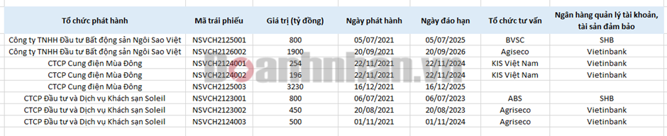 Dựa theo số liệu của HNX thì trong năm 2021, 3 công ty trên đã có 8 đợt phát hành trái phiếu với tổng trị giá 8.130 tỷ đồng: Cung Điện Mùa Đông - 3.680 tỷ đồng, Ngôi Sao Việt - 2.700 tỷ đồng, Soleil - 1.750 tỷ đồng. Còn khoảng 1.900 tỷ đồng trái phiếu có khả năng cao được phát hành trong tháng 03/2022 nhưng chưa được đưa thông tin lên website của HNX.