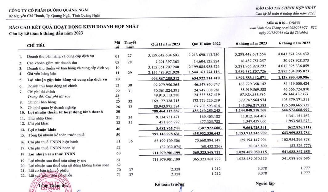 Công ty cổ phần Đường Quảng Ngãi (mã ck: QNS) vừa công bố báo cáo tài chính hợp nhất quý II/2023 với 3.152 tỷ đồng doanh thu thuần, tăng 43% so với cùng kỳ.