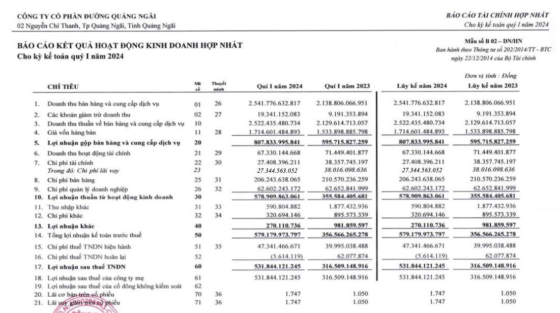 Năm 2024, Đường Quảng Ngãi đặt mục tiêu tổng doanh thu 9.000 tỷ đồng, lợi nhuận sau thuế 1.341 tỷ đồng; lần lượt giảm 14% và 39% so với thực hiện năm 2023. Kết thúc quý I/2024, Công ty lãi trước thuế trên 579 tỷ đồng, tương đương thực hiện được 39% mục tiêu lợi nhuận năm.