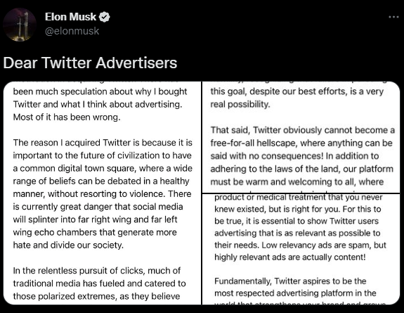 Sau thương vụ thâu tóm 44 tỷ USD gần đây, Elon Musk lập tức bắt tay thay đổi cơ cấu mạng xã hội nổi tiếng này. Trước khi giao dịch hoàn tất, tỷ phú Elon Musk có chia sẻ: "Tôi muốn mua lại Twitter vì nó quan trọng với tương lai của nhân loại, con người cần có một sân chơi trực tuyến chung. Tại đây mọi người có thể tự do thảo luận về bất kì vấn đề nào trên đời mà không kết thúc bằng bạo lực... Tôi làm điều này để giúp nhân loại, những người tôi yêu quý".