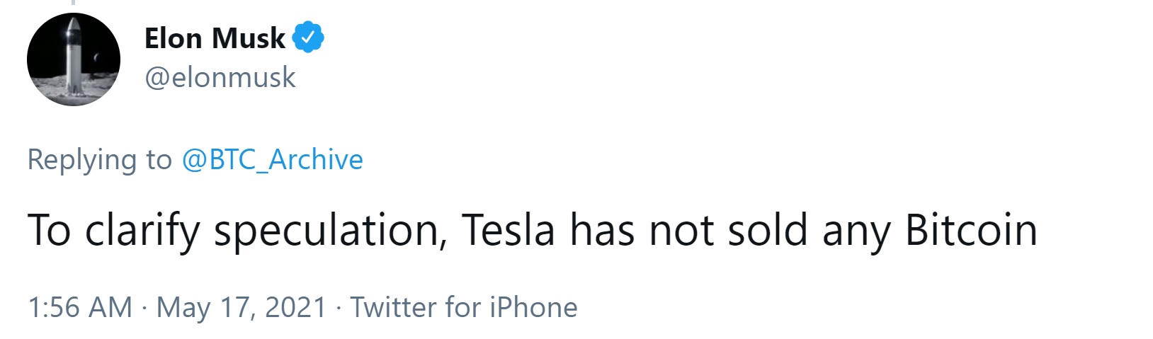 Sau đó đã xuất hiện nhiều đồn đoán rằng Tesla rất có thể đã bán Bitcoin khi Musk trả lời một tweet của một người dùng Twitter có nickname @cryptowhale với nội dung: “Những người sở hữu Bitcoin sẽ tự vả mặt mình trong quý tới khi họ phát hiện ra Tesla đã bán toàn bộ danh mục tiền ảo. Với sự căm ghét mà Elon Musk sắp đón nhận được, tôi sẽ chẳng trách anh ta”. Đáng chú ý là Elon Musk cũng trả lời trên dòng tweet này: “Thật đấy”.