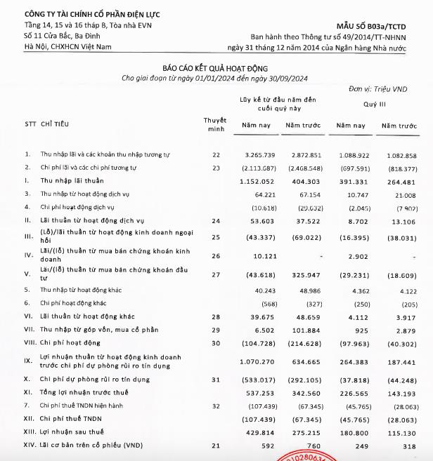 Về bức tranh tài chính, theo báo cáo tài chính quý III/2024, thu nhập lãi thuần của EVF tăng 48% so với cùng kỳ, đạt hơn 391,3 tỷ đồng.