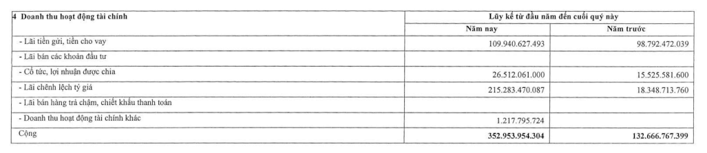 Trong kỳ, doanh thu hoạt động tài chính ghi nhận tăng mạnh lên mức 102,3 tỷ đồng trong khi cùng kỳ chỉ vỏn vẹn 3,1 tỷ đồng. Kết quả này có được nhờ vào khoản cổ tức 26 tỷ đồng nhận được từ các công ty con và công ty liên kết, cùng khoản lãi chênh lệch tỷ giá.