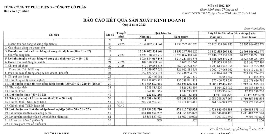 Khấu trừ chi phí, giá vốn, EVN Genco3 báo lãi sau thuế đạt 1.103,9 tỷ đồng, tăng gần gấp đôi so với cùng kỳ, quý II/2022 ghi nhận đạt 576,9 tỷ đồng.