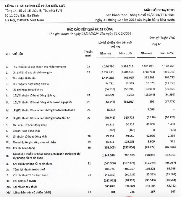 Công ty Tài chính cổ phần Điện lực (mã ck: EVF) vừa công bố kết quả kinh doanh quý IV và cả năm 2024.