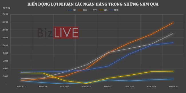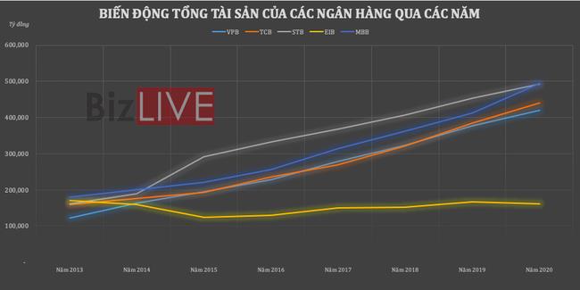 Cụ thể hơn, tổng tài sản của nhóm ngân hàng có cùng quy mô với Eximbank từ năm 2013 như MBBank, Sacombank, Techcombank hay VPBank cũng có sự đột phá lớn trong 7 năm qua, với mức tăng trưởng từ 2 đến 3 lần. Nhóm này đã bỏ lại hoàn toàn và gần như không còn phải so sánh với Eximbank hiện nay nữa.