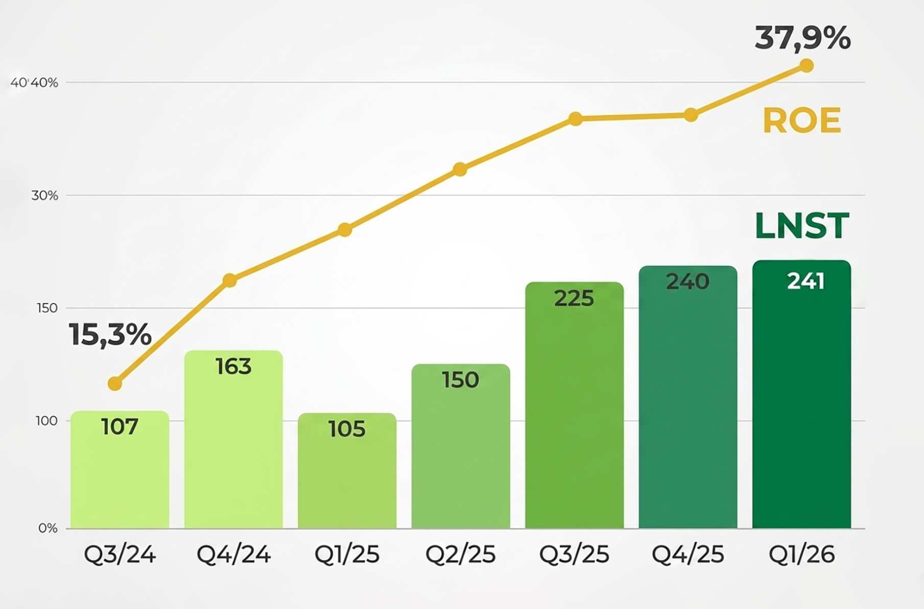 Về các chỉ số tài chính cốt lõi, tỷ suất lợi nhuận trên vốn chủ sở hữu (ROE) trượt 12 tháng đạt 37,9%, cải thiện so với mức 34,4% vào cuối năm 2025. Hệ số nợ trên vốn chủ sở hữu (D/E) giảm từ 1,79 lần xuống 1,69 lần. Trong hoạt động quản trị rủi ro tín dụng, tỷ lệ xóa sổ thuần (Net Write-off) trên tổng dư nợ bình quân ghi nhận ở mức 3,5%/quý.