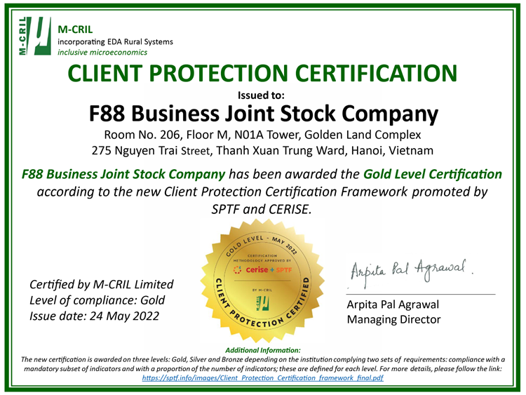 Đáp ứng 7 tiêu chí khắt khe mà tổ chức Smart Campaign (Mỹ) đề ra, một lần nữa, F88 nhận được chứng chỉ vàng về việc Bảo vệ khách hàng (Client Protection Certificate - CPC). Đây là lần thứ 2, F88 nhận được vinh dự này.