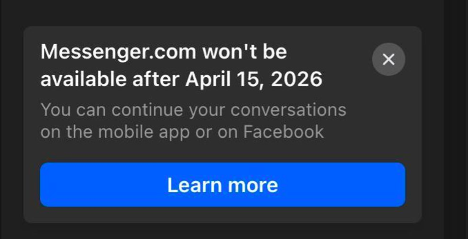 Trước đó, vào ngày 15/12/2025, Meta đã ngừng ứng dụng Messenger Desktop dành cho Windows và macOS. Sau thời điểm đó, trang web Messenger vẫn là lối thoát cho người muốn chat mà không mở Facebook. Tuy nhiên, đến nay, lối thoát đó cũng khép lại.