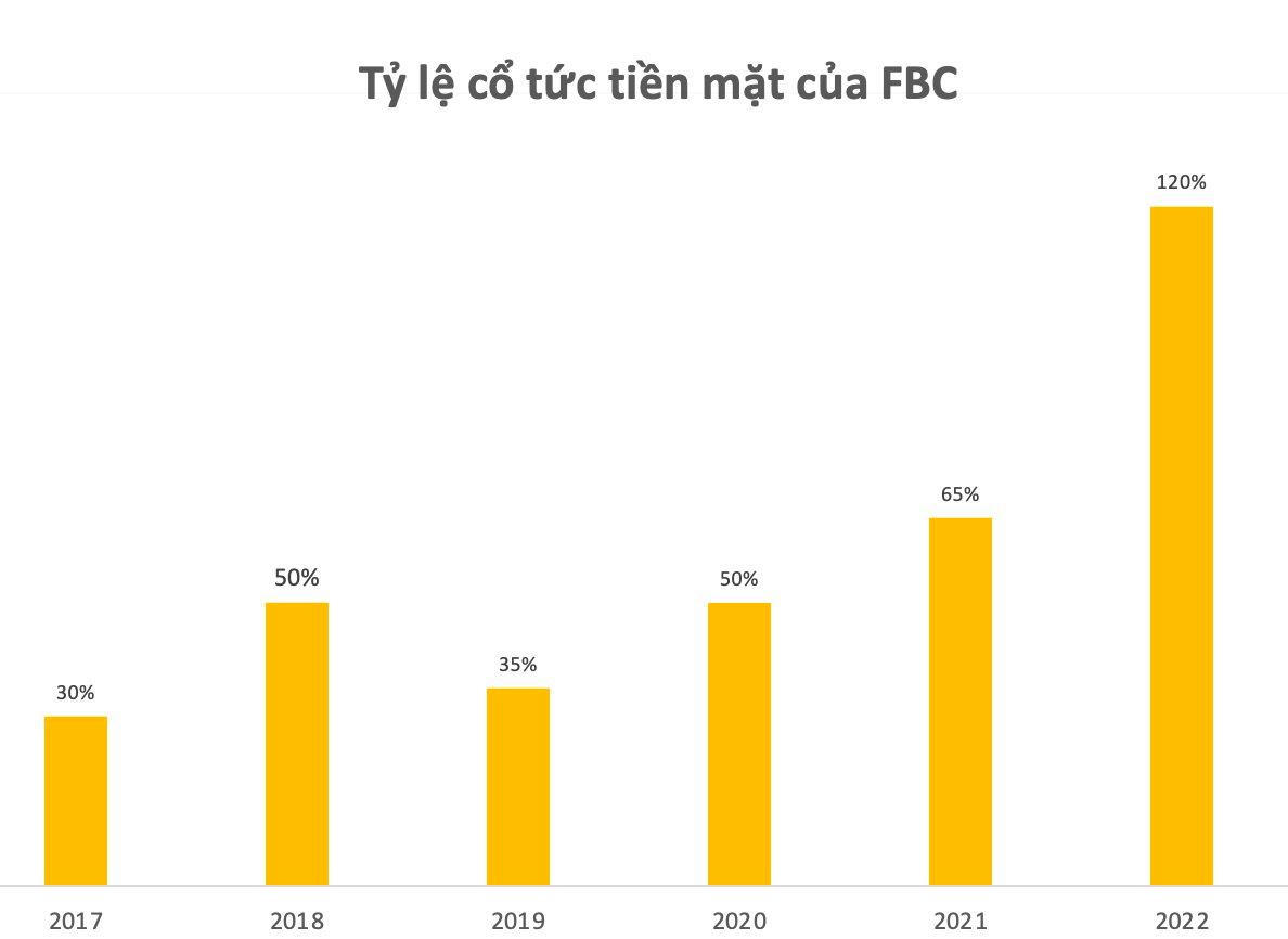 Với 3,7 triệu cổ phiếu đang lưu hành, doanh nghiệp dự chi 44,4 tỷ đồng để thanh toán cổ tức trong đợt này. Như vậy, FBC sẽ dành khoảng 67% lợi nhuận sau thuế năm 2022 (66 tỷ đồng) để chia cổ tức cho cổ đông.