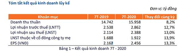 Tính lũy kế 7 tháng, doanh thu tăng 8,2% lên 15.958 tỷ đồng, LNTT đạt 2.862 tỷ đồng và lợi nhuận sau thuế cổ đông công ty mẹ tăng 13,9% đạt 1.922 tỷ đồng. Biên LNTT tăng lên 17,9% từ 17,2% cùng kỳ năm trước.