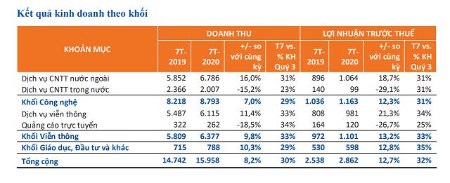 Năm 2020, FPT đề ra mục tiêu doanh thu 32.450 tỷ và lợi nhuận trước thuế ở mức 5.510 tỷ đồng. Với kết quả trên, doanh nghiệp hoàn thành 49% chỉ tiêu doanh thu và 52% kế hoạch lợi nhuận năm sau 7 tháng.