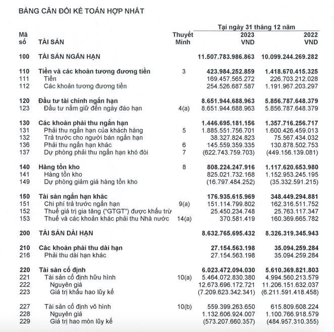 Tính đến ngày 31/12/2023, tiền và khoản tương đương tiền chỉ còn 423,9 tỷ đồng - chủ yếu là tiền gửi ngân hàng. Bên cạnh đó, công ty còn có hơn 8.651 tỷ đồng tiền gửi có kỳ hạn tại ngân hàng.