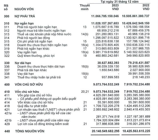 Dù vậy, công ty cũng chịu gánh nặng nợ vay. Tổng nợ phải trả tính đến cuối năm 2023 là 11.066 tỷ đồng, tăng hơn 500 tỷ đồng so với hồi đầu năm.