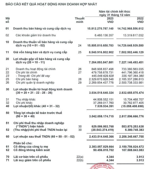 Tính chung cả năm 2023, công ty ghi nhận doanh thu thuần đạt gần 15.806 tỷ đồng và lợi nhuận sau thuế đạt 2.433,5 tỷ đồng, lần lượt tăng 7% và 7,7% so với năm trước. Đây là mức lợi nhuận kỷ lục doanh nghiệp này, nối dài chuỗi tăng trưởng lợi nhuận 6 năm liên tiếp.