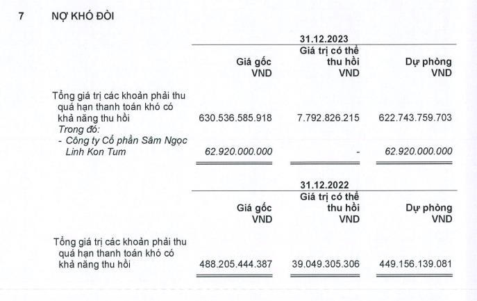 Giá trị có thể thu hồi ước tính chỉ khoảng 7,79 tỷ đồng, chiếm 12%. Trong khi đó, FPT Telecom lại ghi nhận 62,9 tỷ đồng nợ khó đòi với Công ty cổ phần Sâm Ngọc Linh Kon Tum và phải dự phòng toàn bộ.