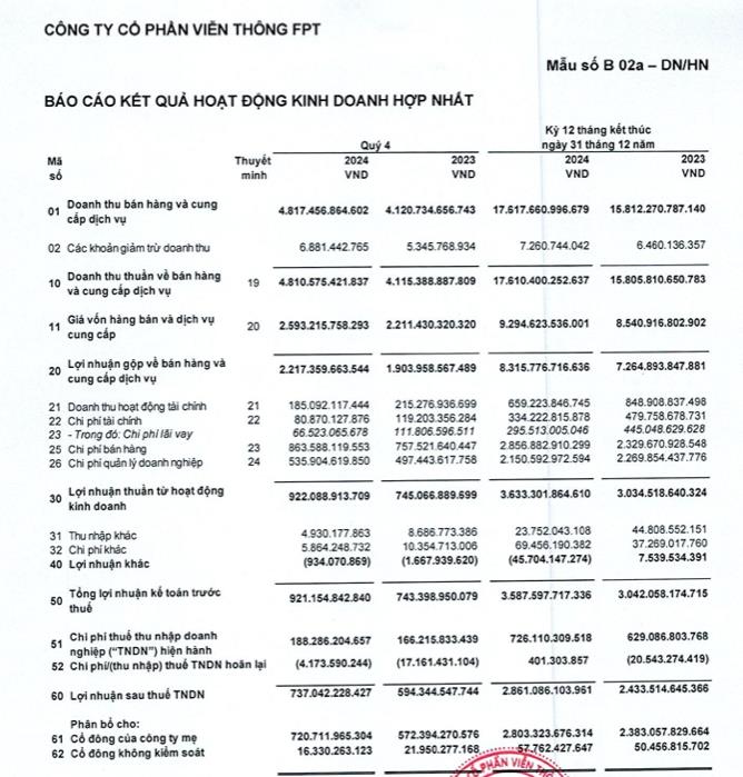Luỹ kế năm 2024, FPT Telecom đạt 17.610 tỷ đồng doanh thu thuần và 2.861 tỷ đồng lợi nhuận sau thuế, lần lượt tăng 11% và 18% so với năm 2023.