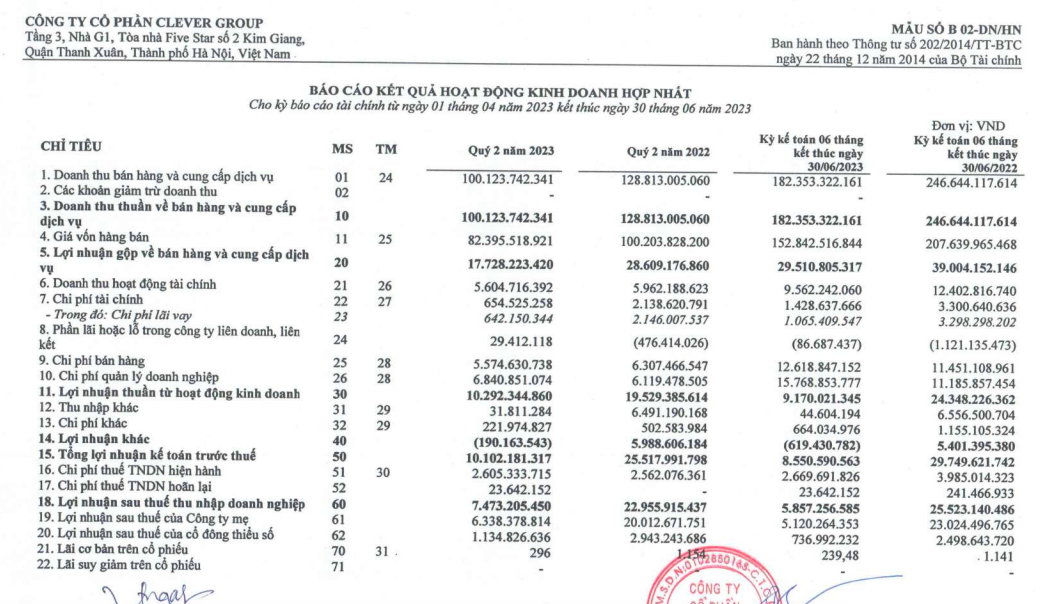 Về kết quả kinh doanh, quý II/2023, công ty Clever Group ghi nhận doanh thu thuần đạt 100,1 tỷ đồng, giảm 22,2% so với cùng kỳ. Giá vốn hàng bán giảm 17,8% về mức 82,3 tỷ đồng, kéo lợi nhuận gộp giảm 38,1% xuống mức 17,7 tỷ đồng.