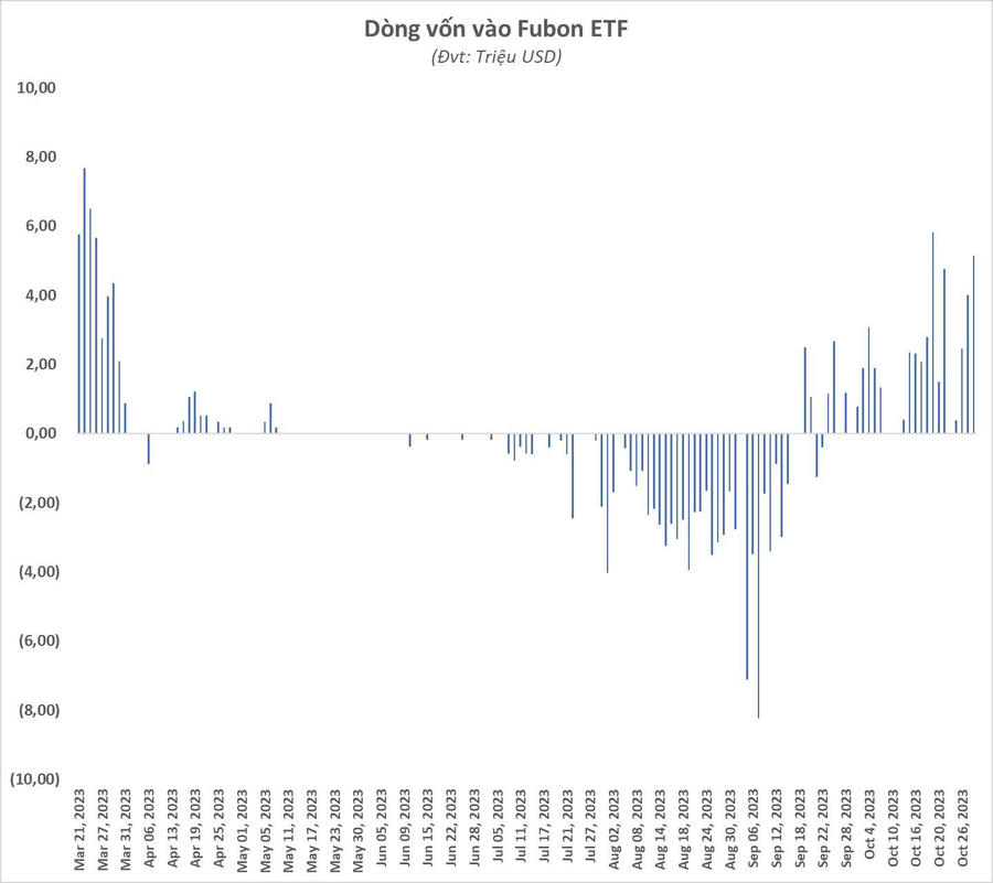 Nhờ hút ròng trở lại, tổng giá trị dòng vốn vào Fubon ETF lũy kế từ đầu năm 2023 đến nay đạt gần 35 triệu USD (~860 tỷ đồng).