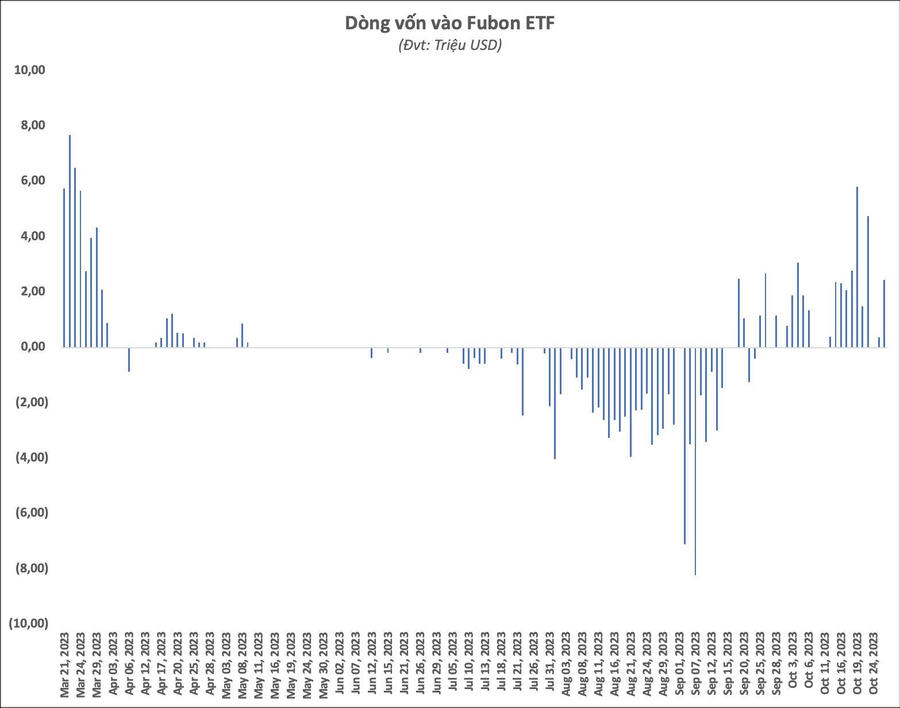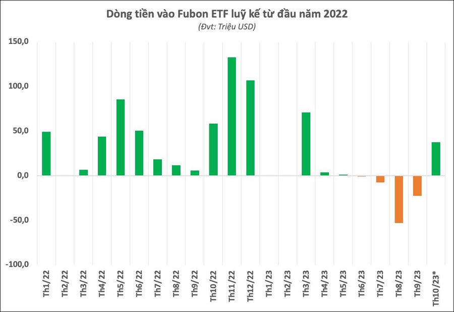 Tính chung từ phiên 19/9 tới hết phiên 27/10, lượng vốn Fubon FTSE Vietnam ETF huy động ròng lên tới 45 triệu USD, tương ứng giải ngân khoảng 1.100 tỷ đồng.