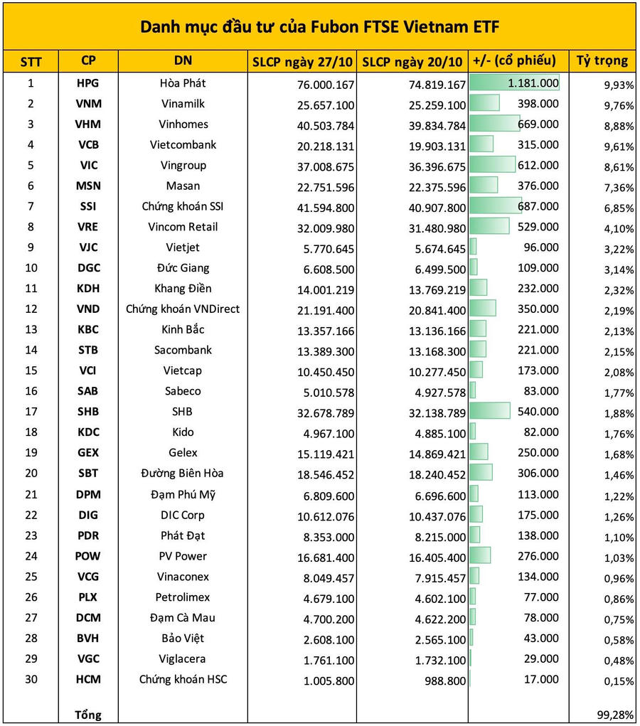 Tại ngày 27/10, quy mô danh mục Fubon FTSE Vietnam ETF đạt 23,59 tỷ Đài Tệ, tương ứng gần 17.900 tỷ đồng, quỹ dành 100% đầu tư vào cổ phiếu Việt Nam theo chỉ số tham chiếu là FTSE Vietnam 30 Index. Trong cơ cấu danh mục Fubon ETF, HPG hiện là cổ phiếu chiếm tỷ trọng lớn nhất với 9,9% (nắm giữ 76 triệu cổ phiếu), xếp tiếp theo lần lượt là VNM (9,76%), VCB (9,6%), VHM (8,88%), VIC (8,6%)…