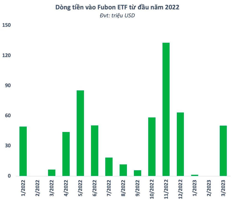 Fubon ETF bắt đầu rót vốn vào thị trường chứng khoán Việt Nam từ tháng 3/2021 và ngay lập tức hút vốn rất mạnh. Trong năm 2022, ETF này là “thỏi nam châm” hút khối ngoại bậc nhất thị trường với giá trị dòng tiền vào lên đến hơn 526 triệu USD (~12.300 tỷ đồng). Sau khi giải ngân hết đợt huy động lần thứ 4 hồi đầu năm, quỹ đã chững lại trong khoảng hơn 2 tháng trước khi hút vốn trở lại thời gian gần đây.