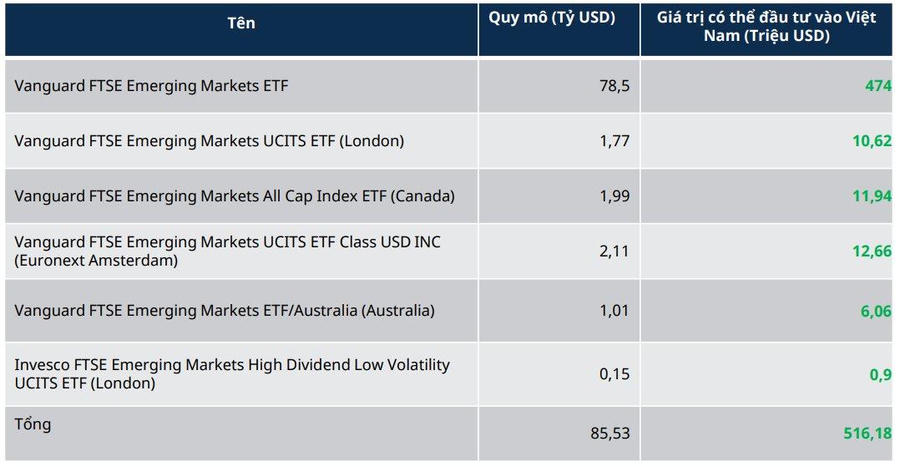 Trong số các quỹ ETF được dự báo sẽ đổ tiền vào Việt Nam sau khi nâng hạng, Vanguard FTSE Emerging Markets ETF là cái tên nổi bật với quy mô gần 79 tỷ USD. Riêng ETF này được dự báo sẽ rót khoảng 474 triệu USD để mua cổ phiếu Việt Nam.