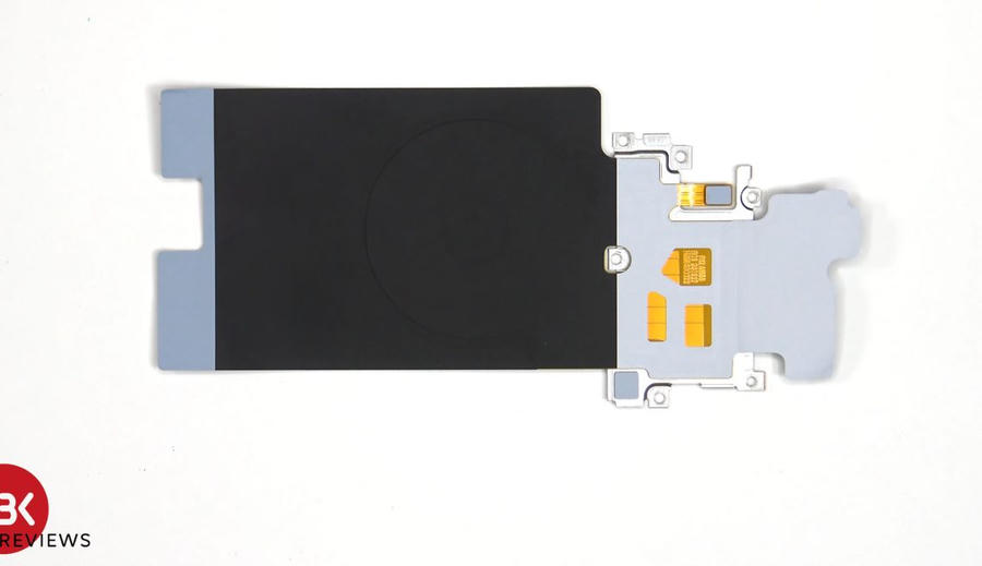 Bắt đầu tháo mặt lưng thiết bị bằng việc áp dụng hơ nhiệt, sau đó là cạy mặt kính phía sau. Khi mặt kính sau được tách ra sẽ thấy cuộn sạc không dây và NFC được tích hợp thành một khối có lớp than chì để truyền nhiệt. Để tháo toàn bộ cụm chi tiết này sẽ cần phải tháo 21 chiếc ốc vít.