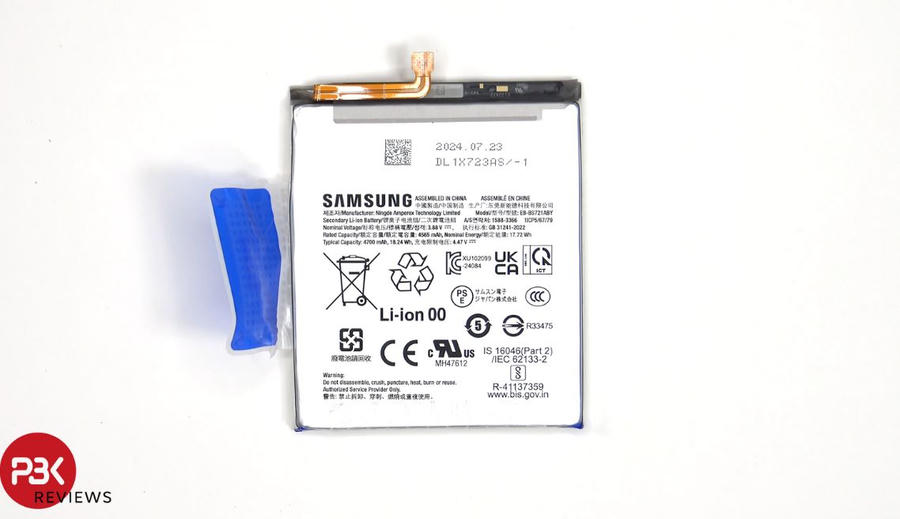 Pin của S24 FE được cố định bằng loại keo kéo, giúp quá trình tháo lắp sửa chữa pin trở nên dễ dàng hơn. Bên dưới pin và lớp màng nhựa có thể thấy hệ thống buồng hơi lớn hơn so với Galaxy S23 FE.