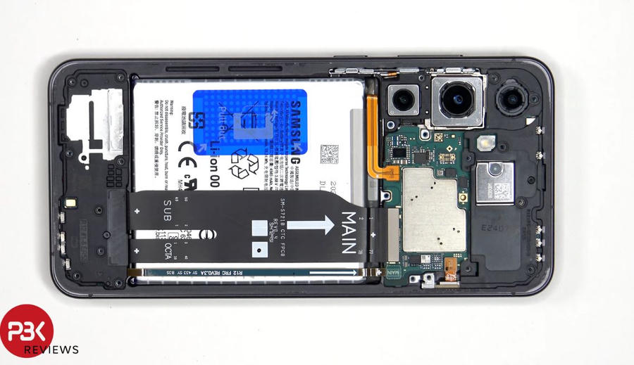 Các bộ phận khác có thể được tháo sau khi ngắt kết nối cáp của pin khỏi bo mạch chính. Loa thoại được kết nối với một bo mạch nhựa riêng biệt, camera selfie 10MP dễ dàng tách ra khỏi bo mạch chính cùng với nơi gắn ba camera sau thay vì được dán cố định như ở Galaxy S23 FE, đây là một cải tiến từ Samsung.