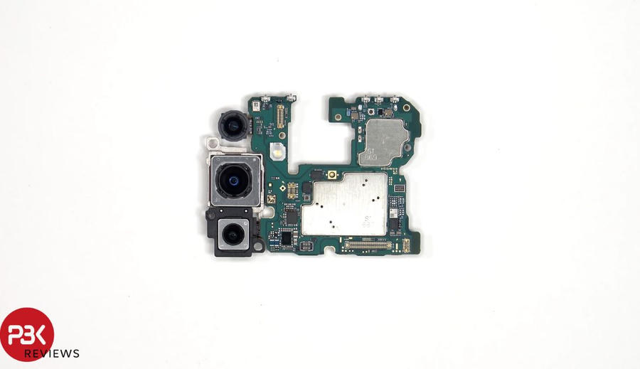 Sau khi tháo thêm một chiếc ốc vít đã có thể tháo bo mạch chính của máy, nơi tích hợp cả 3 camera sau, đèn flash LED và microphone. Bo mạch này còn tích hợp cảm biến ánh sáng môi trường, khe cắm SIM và miếng đệm than chì giúp tản nhiệt tốt hơn. Bên dưới miếng đệm là lớp keo tản nhiệt trên RAM, được đặt trên bộ vi xử lý Exynos 2400e.