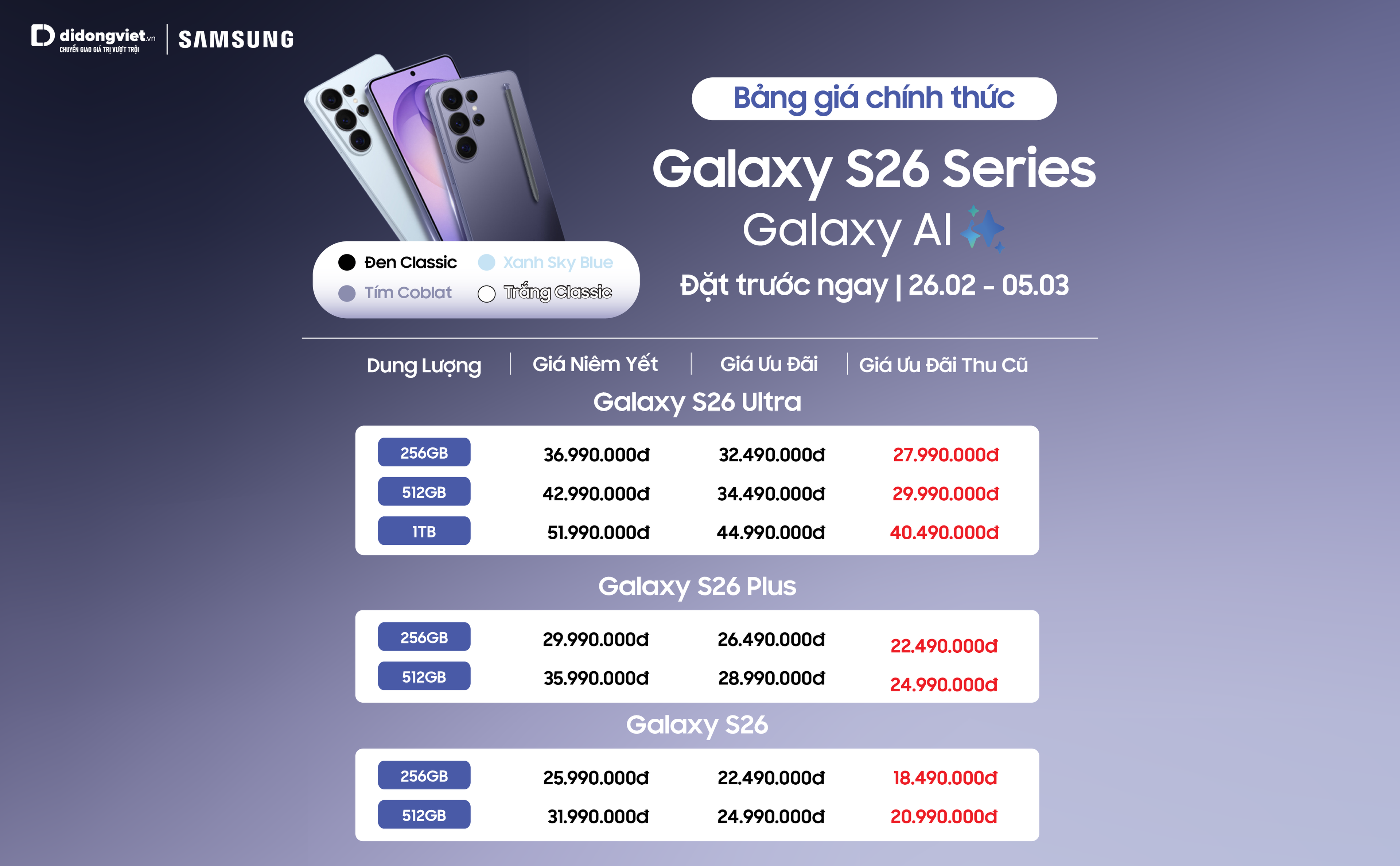 Galaxy S26 series tại Di Động Việt: Tổng ưu đãi đến 16 triệu đồng, sở hữu sớm với giá cuối chỉ từ 18,49 triệu đồng