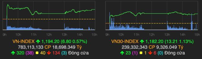 Chốt phiên, VN-Index tăng 0,57% lên 1.194,2 điểm. VN30-Index có phần vượt trội hơn khi tăng hơn 1,1% lên 1.182 điểm. Trên sàn Hà Nội, HNX-Index và UPCOM-Index cùng tăng hơn 1%.