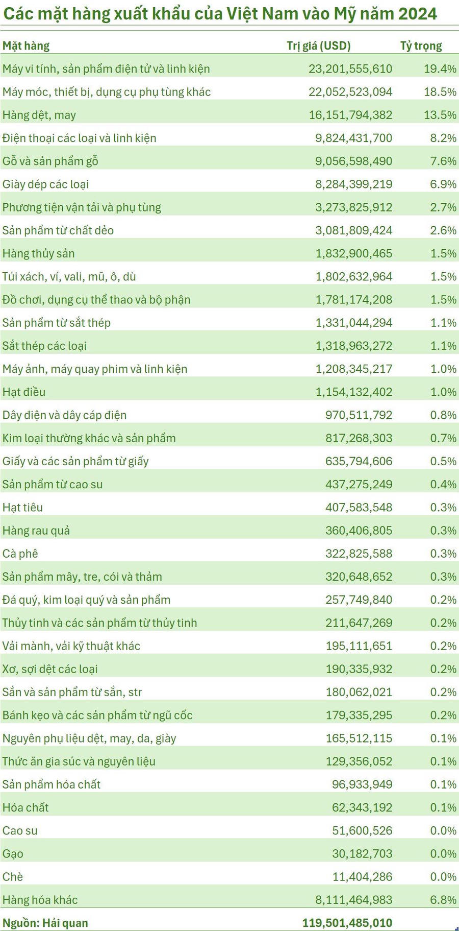 Theo số liệu thống kê sơ bộ từ Tổng cục Hải quan, kim ngạch xuất khẩu hàng hóa của Việt Nam sang thị trường Hoa Kỳ (Mỹ) trong năm 2024 đã đạt mức ấn tượng, ghi nhận con số 119,5 tỷ USD. Cùng kỳ, Việt Nam nhập khẩu khoảng 15,1 tỷ USD hàng hóa từ Mỹ, tiếp tục duy trì thặng dư thương mại lớn với đối tác quan trọng này.