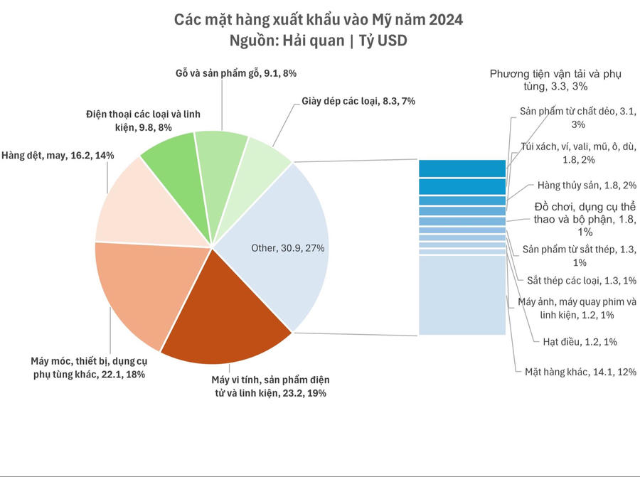 Gần 120 tỷ USD hàng hóa Việt Nam xuất sang Mỹ năm 2024, điện tử và dệt may chiếm tỷ trọng lớn
