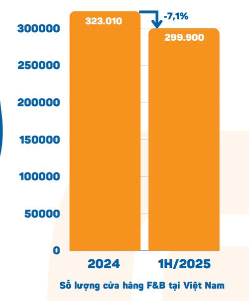 Báo cáo đề cập, tính đến 30/6/2025, thị trường F&B Việt Nam ghi nhận còn khoảng 299.900 cửa hàng đang hoạt động, giảm 7,1% so với mốc 323.010 cửa hàng vào cuối năm 2024. Cả Hà Nội và TPHCM đều ghi nhận mức giảm trên 11% phản ánh sự khó khăn của thị trường. Sự thu hẹp này cho thấy một thực tế khắc nghiệt: thị trường đã mất đi gần 30.000 điểm kinh doanh chỉ trong nửa đầu năm.
