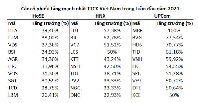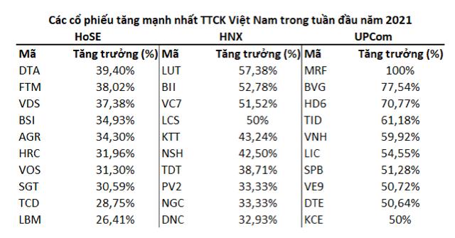 MRF của Merufa với mức tăng trưởng 100% là cổ phiếu tăng mạnh nhất TTCK Việt Nam trong tuần đầu năm mới. Tuy nhiên, thanh khoản cổ phiếu này khá thấp và không nhiều nhà đầu tư có thể tham gia. Trong khi đó, DTA là mã tăng trưởng mạnh nhất HoSE với mức tăng 39,4% trong tuần qua. Các cổ phiếu ngành chứng khoán cũng ghi nhận đà bứt phá, có thể kể tới như VDS (+37,38%), BSI (+34,93%), AGR (+34,3%).