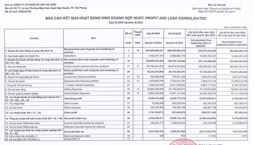 CTCP Đồ hộp Hạ Long (mã ck: CAN) vừa công bố báo cáo tài chính hợp nhất quý III/2024 và 9 tháng đầu năm.