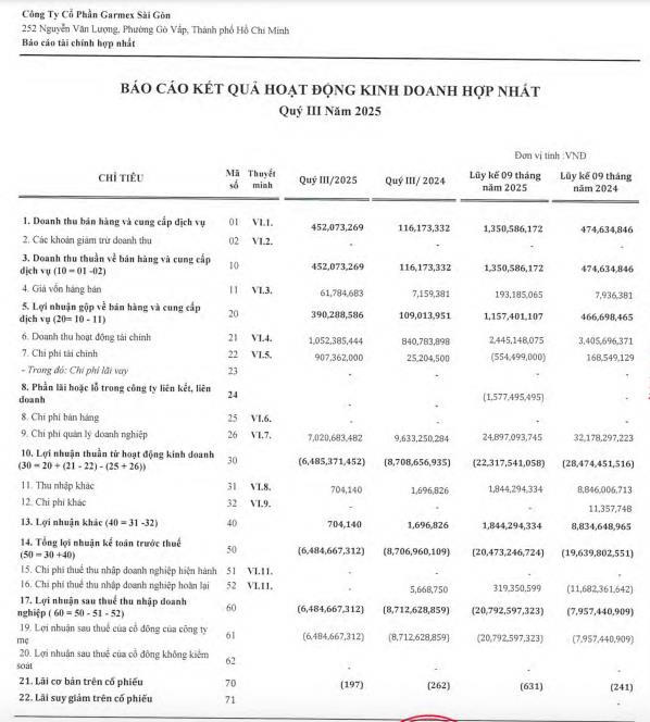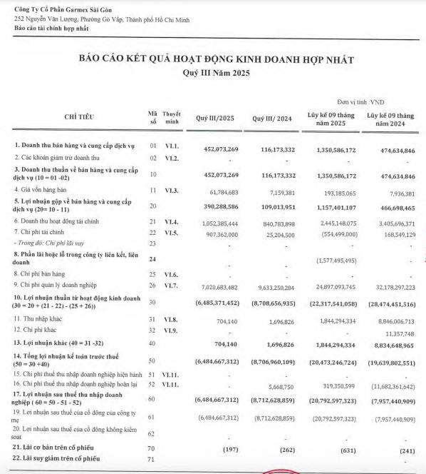 Theo báo cáo tài chính mới đây cho thấy, Garmex Sài Gòn có doanh thu hơn 452 triệu đồng, cao gấp gần 4 lần so với quý III/2024.