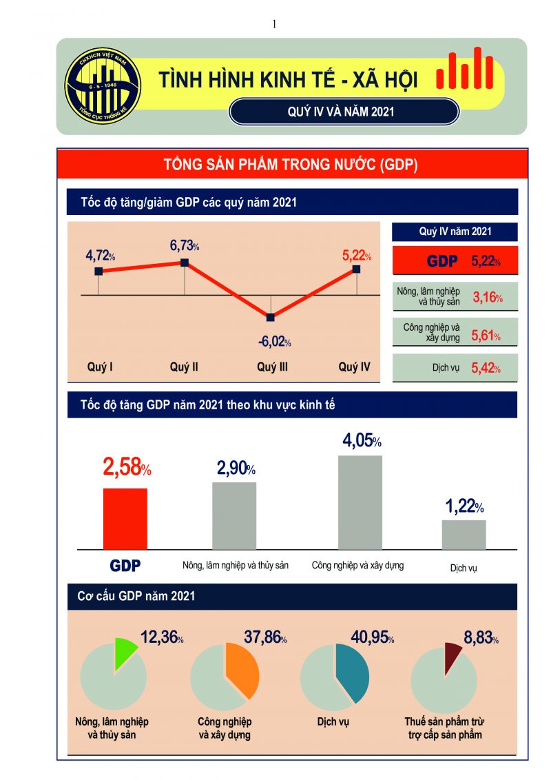 Tăng trưởng kinh tế 3 tháng cuối năm khởi sắc, GDP quý IV ước tăng 5,22% so với cùng kỳ năm trước, cao hơn tốc độ tăng 4,61% của năm 2020, đưa tổng sản phẩm trong nước năm 2021 ước tính tăng 2,58%.