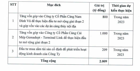 800 tỷ đồng tiếp theo dùng để tăng vốn góp vào Công ty cổ phần Cảng Nam Đình Vũ để thực hiện đầu tư mở rộng giai đoạn 2 và góp vốn vào các dự án cảng thủy nội địa. Còn lại 209 tỷ đồng sẽ được đầu tư mua sắm tài sản cố định để phát triển hoạt động kinh doanh của Gemadept.