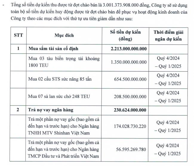 Phần lớn số tiền thu về, cụ thể là 2.213 tỷ đồng sẽ được dùng để mua sắm tài sản cố định, bao gồm 3 tàu biển trọng tải khoảng 1.800 TEU, 2 cẩu STS sức nâng 85 tấn và 7 sà lan sức chở 248 TEU.