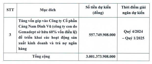 GMD có thể huy động hơn 3.001 tỷ đồng trong đợt chào bán này. Thời gian dự kiến giải ngân là trong quý IV/2024 và quý I/2025. Nếu thành công, vốn điều lệ của GMD sẽ được nâng lên gần 4.140 tỷ đồng.