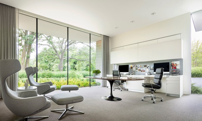 Không gian làm việc hiện đại với đầy đủ tiện nghi cần thiết. Khung cửa kính cao rộng kết hợp với thiên nhiên bên ngoài tạo thành bức tranh phong cảnh bình yên.