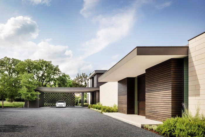 Ngôi nhà để dành một khoảng sân rộng rãi, thoải mái để đậu xe phía trước nhà.