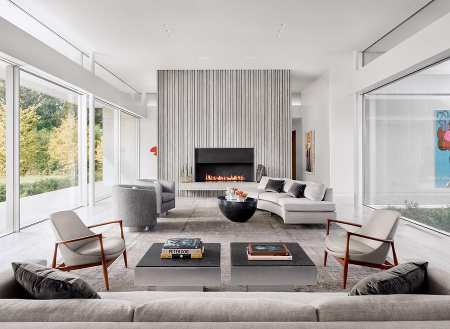 Toàn bộ nội thất trong nhà đều có thiết kế hiện đại với gam màu trắng sáng chủ đạo. Phòng khách sở hữu tầm nhìn thoáng đẹp ra cảnh quan thiên nhiên xanh mát bên ngoài.