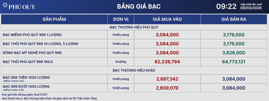 Tại Tập đoàn Vàng bạc Đá quý Phú Quý, giá bạc miếng 999 loại 1 lượng giao dịch ở mức 3,084 - 3,179 triệu đồng/lượng (mua vào bán ra). Trong khi đó, bạc thỏi 999 loại 1kg của thương hiệu này được giao dịch ở mức 82,23 - 84,7 triệu đồng/kg.