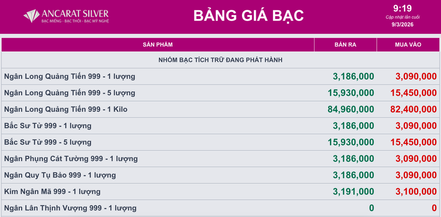 Tại Công ty cổ phần Kim loại quý Ancarat, giá bạc miếng 999 loại 1 lượng niêm yết ở mức 3,090 - 3,186 triệu đồng/lượng. Còn bạc thỏi 999 loại 1kg được giao dịch quanh ngưỡng 82,4 - 84,96 triệu đồng/kg (mua - bán).